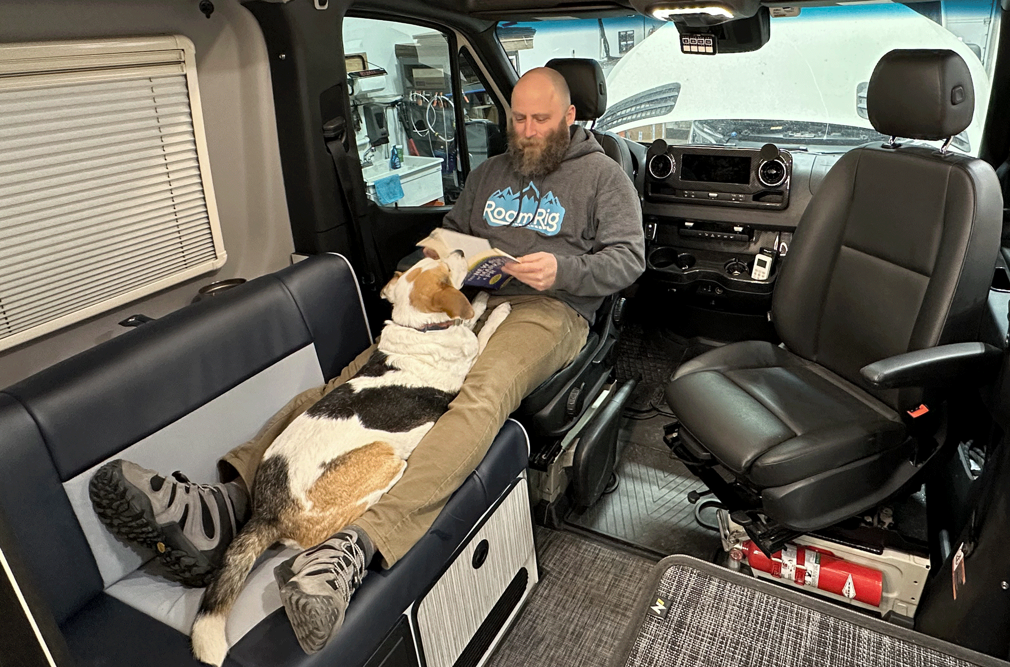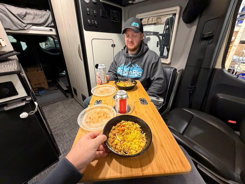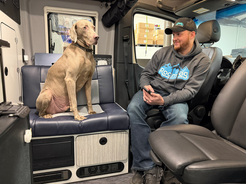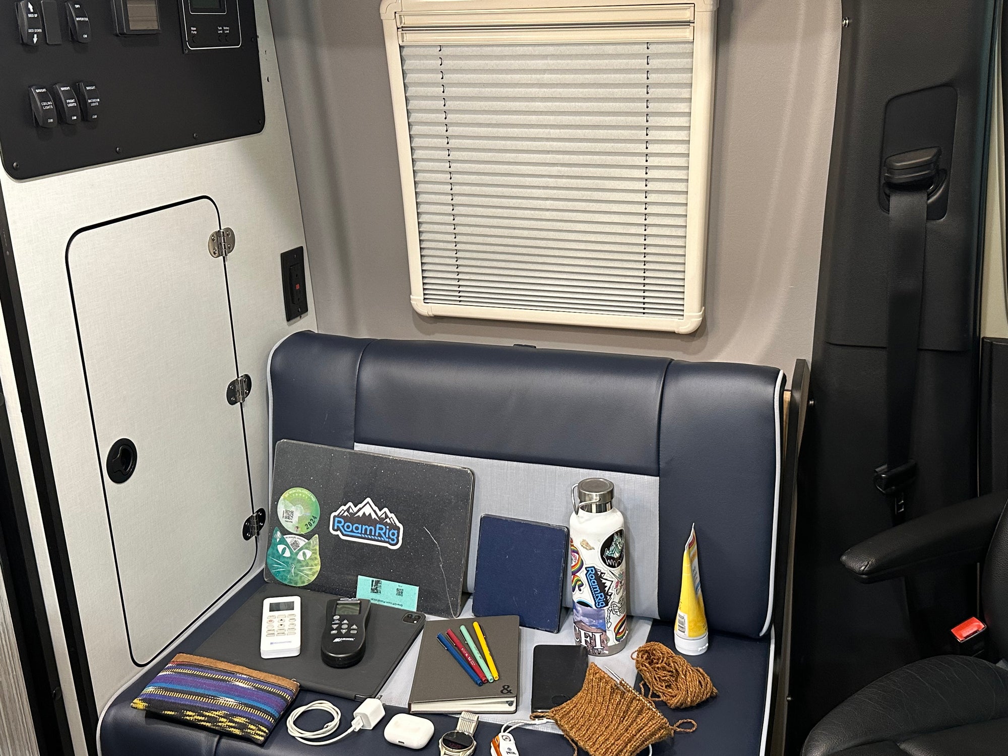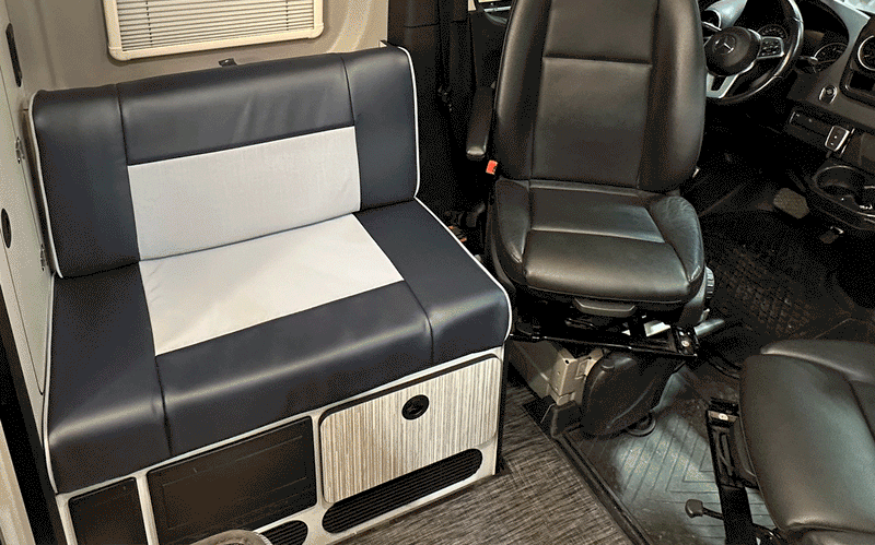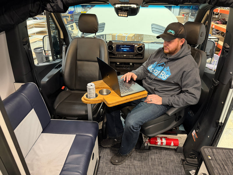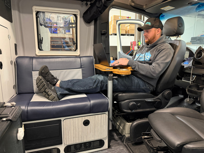 The RoamRig bench seat rotation works for 2nd and 3rd Generation Revels that have stock power systems or RoamRig power systems. It also works for vans with stock plumbing or the RoamRig plumbing upgrade. We can also do power system and plumbing upgrades when we rotate your seat – ask us about bundle discounts!